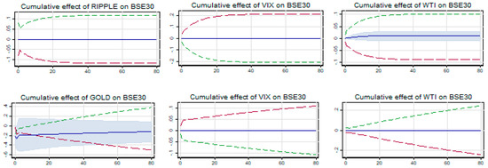 No asymmetric relationship was found between the BSE Sensex and all five cryptocurrencies along with gold, both in the long and short run as evidenced from the results in Table 10. The positive and significant long-term cointegrating coefficient LX rejects the safe haven opportunity of Bitcoin, Ethereum, and Monero, and also gold for BSE Sensex. However, no significant cointegrating relationship with Dash and Ripple implies a weak safe haven opportunity for BSE Sensex. Although both Dash and Ripple are shown to be the safe haven for BSE Sensex during the COVID-19 financial crisis, its effectiveness however depends on the sustainability of this relationship to any short-term shocks from both cryptocurrencies. The cumulative multiplier graph (see Figure 6) shows the moderate impact on BSE Sensex of changes if Dash gets corrected and restored back to the cointegrating relationship within 28–30 days of the impact. However, in the case of Ripple, the impact is persistent, and thus any short-term impact on cointegrating relationships due to shocks from Ripple are not restored. Therefore, it can be concluded that during financial crisis, Dash acts as a weak safe haven for investors in BSE Sensex.