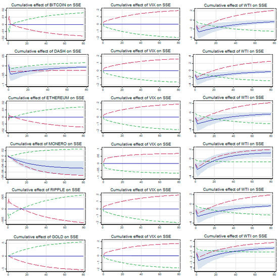 The relationship between SSE and all five cryptocurrencies is asymmetric (symmetric) in long term (short term) as evidenced from the results in Table 13. However, the relationship is reverse in case of gold, i.e., short-term asymmetry and long-term symmetry. The long-term asymmetry could be ascribed only to negative changes in cryptocurrencies as no impact is visible for any positive changes. While the long-term positive cointegrating coefficient is not significant, its negative counterpart is significant for all five cryptocurrencies. Therefore, it establishes a strong safe haven opportunity for SSE in the COVID-19 crisis period. At the same time, as the long-term cointegrating coefficient of gold is significantly positive, it rejects any kind of safe haven opportunity with SSE in this crisis period. Further, as evidenced from the cumulative multiplier graph (Figure 9), it shows the sustainability of this safe haven relationship between SSE and all five cryptocurrencies. Because the impact of the short-term shocks due to unit changes in cryptocurrencies is temporary across all cryptocurrencies, the impacts get adjusted towards the equilibrium in 8–10 days. Thus, all five cryptocurrencies could be a safe haven for investors in SSE.