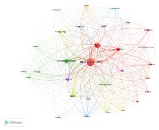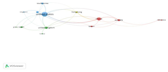The bibliometric coupling findings are shown in Figure 2; each circle represents a nation, and the size of the circle denotes the contribution. The more the input, the larger the size. Figure 2 depicts three groupings based on the papers’ bibliographic coupling. The United Kingdom leads the green cluster, while the United States, Australia, and China dominate the red cluster. France and Tunisia are part of the blue color cluster. Another fascinating topic is how authors from other countries have collaborated with authors from other countries. We do a co-authorship analysis with nations.