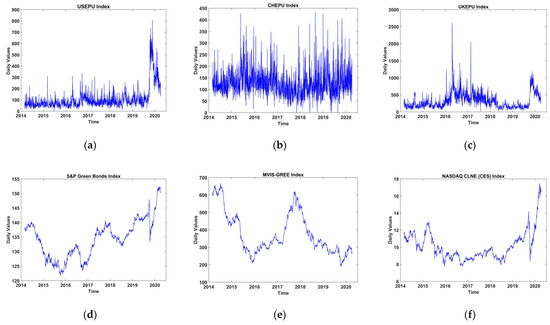 Original data. Note: Figure 1 potrays the level series for the considered time period. Subfigures (a) USEPU daily values, (b) CNEPU daily values, (c) UKEPU daily values, (d) S&P green bonds daily index, (e) MVIS global rare earth elements daily index. and (f) US clean energy stocks daily index.