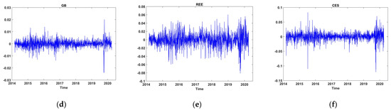 This study considered the daily prices of green bonds (GB), clean energy stock (CES), the global rare earth elements (REE) index and three EPU indices (US-EPU, China-EPU, and United Kingdom-EPU). Five days of a week were considered starting from 11 March 2014 to 29 September 2020 for all indices due to daily data unavailability for global rare earth elements. A total number of 1636 observations were considered for full-sample estimation, 1427 before COVID-19 and 209 for during the COVID-19 estimation. The Clean Energy Fuels Corp (CLNE) index by NASDAQ was considered for clean energy stocks. Data on clean energy stocks and global rare earth elements were sourced from www.Investing.com (accessed on 15 October 2020), Green Bonds from the official S&P (Standard and Poor) website, EPU indices for the USA and UK were obtained from www.economicpolicyuncertainty.com (accessed on 15 October 2020), and data for the Chinese Economic policy uncertainty index were sourced from https://economicpolicyuncertaintyinchina.weebly.com (accessed on 15 October 2020). The economic policy uncertainty index is a news-based index and was initially constructed by (Baker et al. 2016).