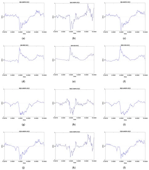 Dynamic Conditional Correlations (B). Note: B refers to the COVID-19 period (1 December 2019 to 30 September 2020) for safe haven properties. Subfigures demonstrate the dynamic conditional correlations, (a–c) DCCs between GB and USEPU, CHEPU and UKEPU respectively. Subfigure (d) DCC between GB and REE, (e) DCC between GB and CES, (f) DCC between REE and CES. Subfigures (g–i) DCCs between REE and USEPU, CHEPU and UKEPU respectively. Likewise, subfigures (j–l) DCCs between CES and USEPU, CHEPU, UKEPU respectively. Authors report a median spline graph to smooth reoccurring variations. The horizontal line demonstrates the zero correlation on the y-axis and time on x-axis.