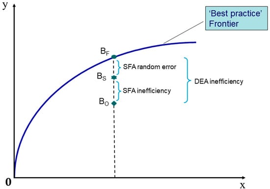 Figure 1 below illustrates the main difference between DEA and SFA. SFA can vary from the best practice DEA frontier due to measurement error and other random factors affecting output. If the error is negative, for example, SFA would be lower than DEA. On the one hand, we calculate inefficiency using DEA as the difference between the estimated output function f(x) and the x generated by xi inputs (measured by the angled line). On the other hand, using SFA, the estimated frontier lies below and the distance from it to x is shorter (measured by the curved line). DEA, therefore, would provide a higher estimate of inefficiency in this situation.