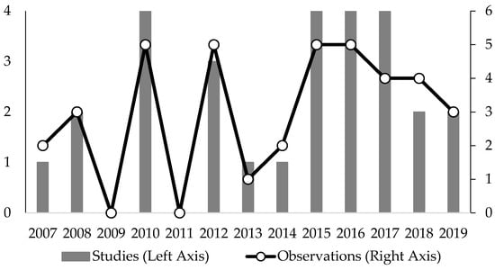 Figure 2 shows that FA studies on Vietnamese banks only emerge from 2007. In the first two years of 2007 and 2008, there were only three articles published, providing a total of five data points or observations in our sample. The number of studies has been increased since 2010, particularly after 2015, resulting in 16 articles and 21 observations for the 2015–2019 period. It is noted that the number of data points belong to the published academic journals representing for 69.23% of the sample whereas working papers accounted for 30.77%. Additionally, the number of studies conducted by a group of authors (58.97%) are higher than those performed by a single author (41.03%). Further information regarding our sample is also presented in Appendix B.