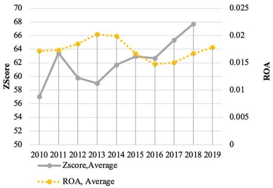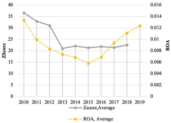 Figure 1 and Figure 2 compare the general trends of ROA and Z-score from 2010 to 2019. In Figure 1, these two indicators seem to have a negative correlation. The bigger the Z-score (the greater the risk), the lower the level of ROA, notably in the period from 2010 to 2015. Until 2019, these two indicators tend to converge. In contrast, for Vietnamese banks the correlation between ROA and Z-score tend to be opposite as they both decrease in the period 2010–2016 and increase gradually since 2016. This partly shows the difference in the relationship between ROA and Z-score in Vietnam and other countries in the region.
