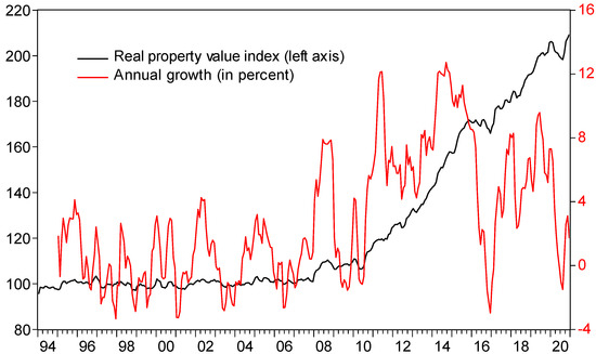 In retrospect, the real property value index grew annually with an upward trend—in terms of its average and dispersion—during the monthly period from January 1995 to December 2020 (Figure 1). Therefore, the historical pattern of real housing prices revealed an increase not only in the average market value of real estate assets owned by households and investors but also in their volatility. This anomalous behavior also implied greater difficulties in market access for vulnerable families who require a housing solution, especially in a context of prolonged high unemployment because of the health crisis caused by COVID-19. Thus, in quantitative terms, the average and dispersion of annual real property value index growth seemed to increase substantially as of 2008. Subperiods selected were based on before and after the international financial subprime crisis. In particular, the average 12-month expansion observed since 2008 (5.6%) was 20 times higher than that registered from 1995 to 2007 (prior to the subprime crisis). Likewise, its volatility has more than doubled in the same period, probably accounting for rising uncertainty.