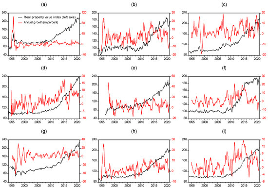 Monthly real property value index and its annual growth rate (1994–2020), disaggregated by type of housing (house and apartment) and according to geographic area: (a) house prices in Metropolitan Region northwest, (b) in the northeast, (c) in the south; (d) apartment prices in Central Santiago, (e) in Metropolitan Region northeast, (f) in the northwest, (g) the south; (h) house prices in the Metropolitan Region; (i) apartment prices in the Metropolitan Region.