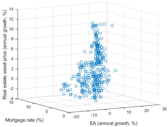 Figure 3 shows the relationship of the real property value index, real mortgage rate, and economic activity index variables. At least two conglomerates of price volatility emerged from the interest rate-housing price relationship. This heterogeneity indicates a relation between the non-linear behavior of real property value index and the financial conditions for access to housing credit. In general, decreases in the real rate of mortgage loans tended to coincide with greater dispersion of real property value index. Likewise, the correlation between both variables was negative (−0.47) and significant at 95% confidence.