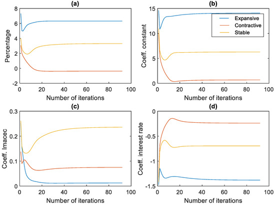 Evolution of the convergence rates of the EM algorithm. (a) Annual real property value index growth (in %); (b) Coefficient of the regression constant; (c) Coefficient that accompanies annual economic activity index growth; (d) Coefficient that accompanies the mortgage interest rate.
