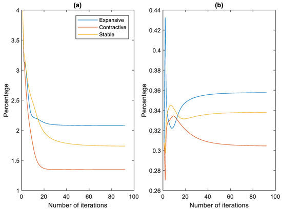 Figure 6 shows the convergence evolution of the standard deviation (or volatility) of the real property value index () for each alternative state (). It also shows the convergence path of the probability measures as the housing price passed through one of these growth regimes . The probability of observing an expansive state of housing price growth on average is 0.36, somewhat higher than that estimated for the other two alternative states (medium and contractive). Therefore, the real property value index growth rate has a certain upward bias.