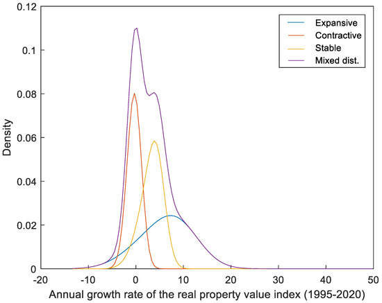 Mixed distribution of the annual growth rate of the real property value index (1994–2020). Distribution function of real property value index annual growth and its alternative states.