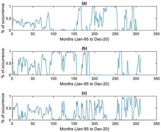 Conditional probabilities for each state of annual real property value index growth (January 1995 to December 2020). (a) Conditional probabilities for the expansive regime, (b) the medium growth regime, (c) the contractive regime.