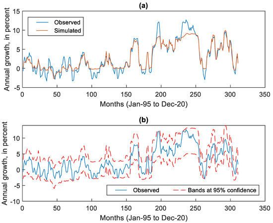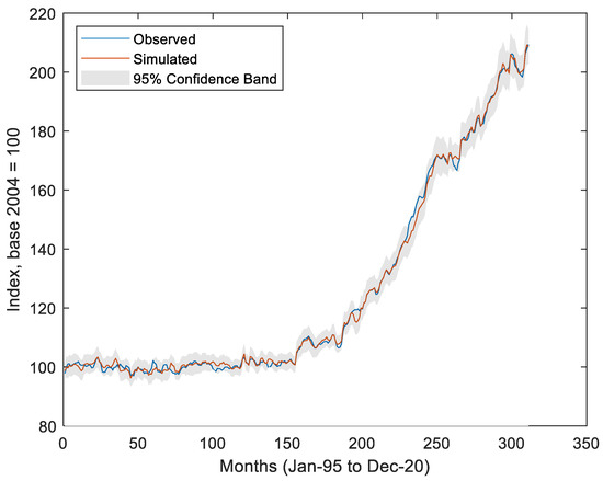 where is the simulated housing price, is the conditional probability of each state j with k optimal iterations that assures the expectation–maximization algorithm application, is the parameter vector relating the actual housing price with its fundamental variables in each alternative state j. is the vector of predetermined variables of the regime change model, the parameter is the conditional variance of the housing price growth rate, and measures the scattering of the price growth within each state j. From definition and a confidence interval for the simulation of the real property value index was constructed. Figure 8 compares the real property value index trajectory with its simulated values based on the estimated parameters of the regime change model. In Figure 8a the resulting determination coefficient was . This means that 92% of the annual growth variance of real property value index was explained by the model. Figure 8b shows that the observed real property value index growth rate fluctuated within the 95% confidence band estimated by the model.