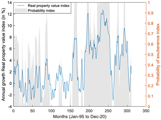 Evolution of the annual real property value index growth rate and its exuberance probability index.