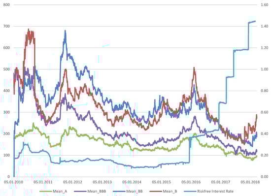In order to provide a better understanding, we utilize our simulation model with a daily rolling window over a sample period from 2010 to 2018. Given the lack of customer-related bank and rating data and assuming the efficient market hypothesis, we focus on observable market spreads versus the risk-free rate on the one hand and the industry risk premia on the other (Table 1).