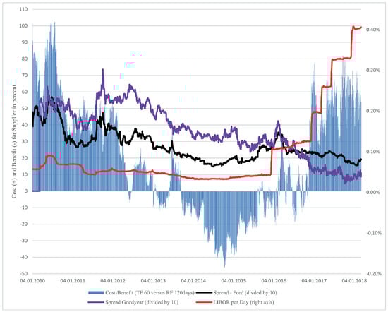 Simulation of cost and benefit trade-off in percent over the business cycle. The figure denotes the cost of reverse factoring in percent (60 vs. 120 days) in comparison to bank credit financing over 60 days (customer: Ford; supplier: Goodyear). Source: Authors’ simulation.