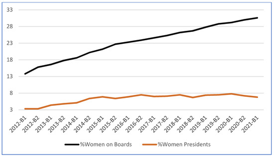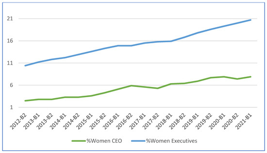 Figure 1 presents the time-series evolution of percentages of women as members on corporate boards and presidents. Data are presented semiannually from 2012 until the first semester of 2021 and are extracted from the Eurostat database. The percentage of board gender diversity has doubled from 13% in 2012 to almost 30% in 2021, suggesting that several countries in the EU have adhered to legislative quotas and replaced their board members with more women. The achieved level is below the goal of 40%; nevertheless, it constitutes a significant improvement over the examined period. Additionally, the percentage of women presidents presented a twofold increase from 3% in 2012 to 7% in 2021, despite the fact that the relative numbers are significantly smaller relative to the percentage of women board members. A similar picture is obtained from Figure 2, which indicates the evolution of women CEOs and executives in European firms. Women executive numbers are higher relative to CEOs and experienced a twofold increase from 10% to 20% over the last decade. Women CEOs comprised 7% of the population during the first semester of 2021 and still showed a significant increase from 1% back in 2012.
