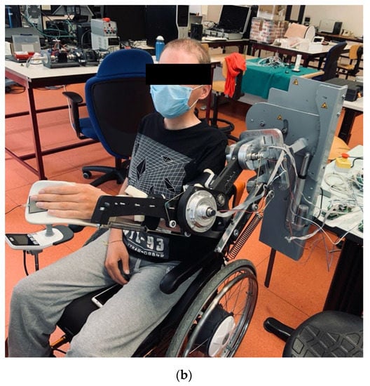 Exoskeletons are mechanical structures that are mostly employed in industrial and rehabilitation fields. In the first case, mechanical structures are used to help the operator to execute heavy tasks. In the second case, rehabilitation requires structures that help the patient to restore or recover lost motion abilities. Depending on the application, exoskeletons can be designed for power amplification [], neuromuscular impairment compensation [,] and rehabilitation [,] and to support disabled people in activities of daily living (ADL) [].