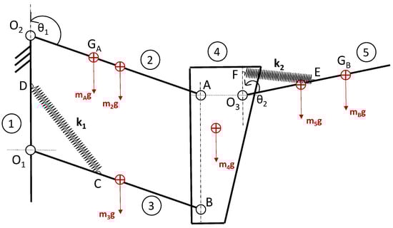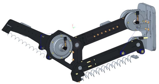 In general, balancing a mass at the end of a two-link open-loop chain is not an easy task []. In this case, the position of the forearm link is defined by the angles θ1 and θ2, so a two-link open-loop chain renders it impossible to relate the direction of the force exerted by the forearm spring to parameter θ2 only (defined as the angle between the vertical and the forearm directions), making the forearm system dependent on both θ1 and θ2. To decouple the two motions, parallelogram linkage was adopted so that link 4 does not change the orientation and to ensure that the forearm link depends only on θ2.