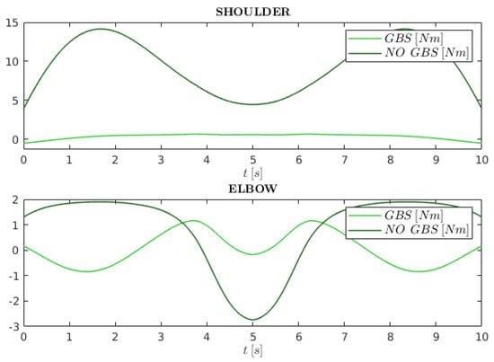 The benefit of employing the GBS is significant: motor torque requirements are reduced by 95% for the shoulder and by about 60% for the elbow (peak and RMS motor torque values are shown in Table 5).