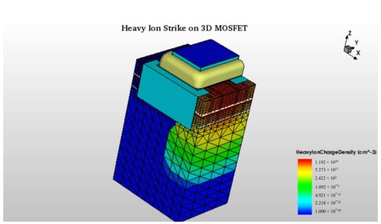 One of the features of TCAD tools is that they provide an effective method to model and simulate the impact of SETs on semiconductor devices through their integrated physics background. In this work, various TCAD simulations are performed to identify the pulse of the generated SET. In particular, several simulations of particles striking the drain of NMOS and PMOS transistors model the induced disturbance. Figure 1 shows the charge generation as a heavy ion strikes the drain of an NMOS transistor with 90° angle, which is vertical to the drain contact, and its distribution within the transistor’s mesh. Additionally, note that the width and the length of the NMOS drain are nm and nm, respectively.