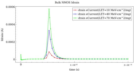 The energy of the radiation particle corresponds to the Linear Energy Transfer (LET) that delivers as it penetrates the semiconductor and is a crucial factor in such type of simulations. The resultant charge generation as a heavy ion strikes the drain is reflected in the drain current. Figure 2 presents the drain current for three different LETs of the heavy ion. This graph shows that the current spike elevates as the energy increases, indicating the significance of heavy ion severity in the generation of SETs and, subsequently, in the emergence of soft errors.