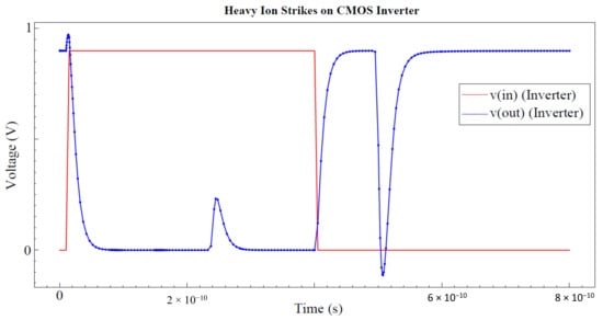 A radiation-aware simulation of an NMOS or PMOS device might be sufficient to model the impact of such hazards on semiconductor devices, but at a logical level, there is an additional step that should to be considered. That is, we need to examine if the charge generation within the device emerges at the output of the corresponding logic gate and, if so, identify the shape (i.e., height, width, and slew) of the SET pulse. Thus, a mixed-mode simulation that combines the semiconductor devices based on physical models (TCAD) with devices described with compact models (SPICE) can be performed to observe the generated SET. In this way, the simulation of a heavy ion striking a node becomes more accurate as we are able to incorporate into the simulation the physical devices (i.e., transistors) that are modeled with a powerful TCAD tool. Figure 3 demonstrates a transient analysis of an inverter, performed with mixed-mode simulation, when two heavy ions strike the gate at different time moments. Note that the time moments are quite close, considering such a small time frame, which a rather unlikely scenario for two radiation particles striking the same cell within a few picoseconds. Therefore, this simulation setup is deliberately presented in this mode, to exhibit in the same graph the effect of SET pulse generation at the output of a logic cell in two cases. The first considers a particle striking the off PMOS transistor device and the second a particle striking the off NMOS, generating at the output a small and a large glitch, respectively. The difference in the SET amplitudes is attributed to the higher sensitivity of NMOS transistor compared to PMOS.