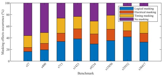 The most significant factor in the estimation of SER in the combinational logic of ICs is the modeling of the three masking effects. Since the masking mechanisms are contingent on the connectivity and the design properties of the individual circuits, their impact varies from one circuit to another. Figure 4 presents the distribution of the generated SETs in an SER estimation process with respect to the type of masking (i.e., logical, electrical, and timing) that occurs or not when the same number of faults are injected. While logical masking appears to be the most prevalent factor contributing to the SET elimination, especially for the large-scale benchmarks, electrical and timing-masking jointly tend to be similarly substantial, if not more. This graph reveals the necessity of a sufficient and accurate modeling of masking mechanisms since this reflects on the SER estimation eventually.