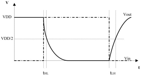 Similarly, Table 2 presents the respective pulse characteristics for the opposite transition, i.e., 1→0→1. However, compared to the previous case, the pulse width of NAND2 gate is calculated with Equation (2).