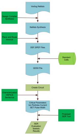 To evaluate the SER considering the proposed electrical and timing-masking models, the ISCAS ’89 benchmarks were synthesized with Synopsys® Design Compiler™, using the 45 nm and 15 nm Open-Cell libraries [25], and their layouts were extracted using Cadence® Innovus™EDA tool. Figure 7 describes the overall procedure of this work.