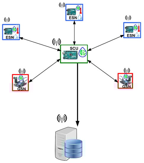 The system is composed of three types of nodes: the sensing and control unit (SCU), the environment sensing unit (ESN) and the greenhouse security unit (GSN). The greenhouse unit (GHU) is a greenhouse containing one SCU, which is the master node and several ESN and GSN “slave nodes”, the number of which depends on the dimensions of the greenhouse.
