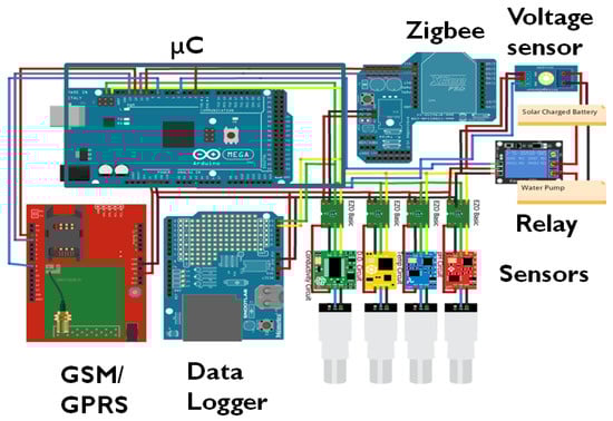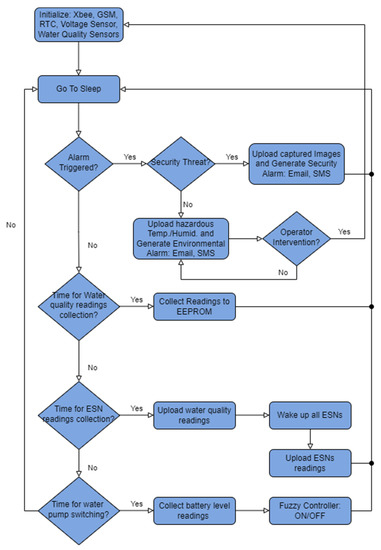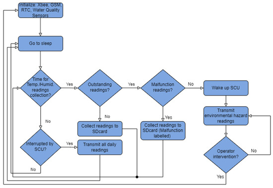 The SCU processing unit used was an Arduino Mega 2560, providing the required processing power, program memory and number of pins to support the following connections: the Xbee shield, the RTC shield, the Atlas Scientific EZO circuits, the GSM shield, the voltage sensor and, finally, the relay module to control the ON/OFF switching of the water pumps. All the shields and modules were supplied by the power drawn out of the Arduino by the 5v and GND pins. Figure 3 depicts the schematic of the SCU, while Figure 4 illustrates its operation using a flowchart.