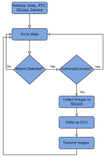 Figure 9 shows a flowchart of the GSN operation. As shown in Figure 9, the node starts by initializing the I2C and SPI communications and ensures proper wiring of the modules. Then, the node falls into sleep mode and remains in that state until motion is detected. After such an event, the node expects an authorized ID tag swap. If no such verification of the identity of the user occurs in the next few seconds, the GSN interrupts the SCU and signals a “Security_Interrupt” inside the first payload, followed by the images that are data captured by the node. The GSN draws power of about 0.53 W in sleep mode and about 0.68 W during transmission depending on the distance from the SCU.