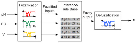 The architecture of the FIE is shown in Figure 10. It accepts three inputs: pH, EC and power supply voltage level. Since the power supply is from the battery being charged by a solar cell, the voltage level reflects the battery level according to the voltage/charge curve. The DO and water temperature are not used for two reasons: first, they are not documented in the literature to have a significant effect on efficient hydroponic culture, and second, using five or six outputs would require a large number of rules, most of which would be redundant. The FIE determines the irrigation duration based on the critical hydroponic parameters and the available energy. The general premise behind the knowledge base of the proposed scheme is to provide the available nutrients to the plants while being conservative with watering when energy and nutrients are low.