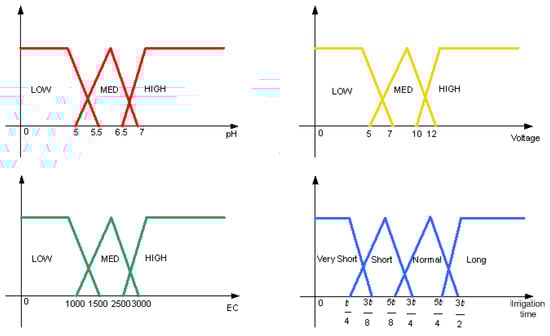 Figure 11 shows the fuzzy membership functions. In order to maintain computational simplicity, we selected trapezoidal and triangular membership functions in the proposed control scheme to describe the linguistic values of the fuzzy input and output variables. The amount of overlap between the membership functions areas was chosen to have at most two membership functions overlapping; thus, we will never have more than six rules activated at a given time. This offers computational simplicity in the implementation of the proposed scheme, which was a design objective. Furthermore, it does not make intuitive sense to have a parameter such as pH being considered as both high and low according to hydroponics guidelines. The EC and pH membership functions were determined based on hydroponics guidelines, while the voltage was based on extending battery life. The irrigation duration membership functions were based on multiples of the baseline irrigation duration from Equation (3). In the case of clearly erroneous sensor values (Section 4.2), the values are not fed to the FIE; instead, the last valid values are used. If the pH and EC values seem correct they are fed to the FIE and the last valid values are updated for the next sensor reading.