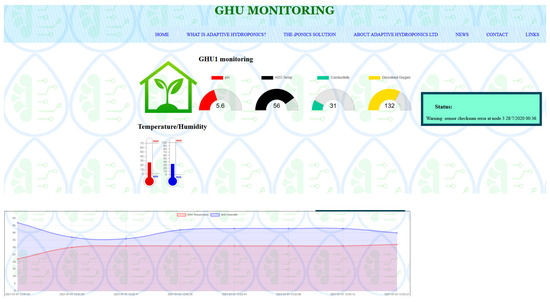 The iPONICS system was operated in a lab environment for over a year (Figure 12) and was installed in a pilot hydroponics greenhouse in order to grow crops. The monitoring website is shown in Figure 13. The ubidots platform was used to upload the data, and our application was built using an API to transfer the data in .csv format and display them. The application was built using javascript, css and html. The user can monitor multiple greenhouses at a glance. It provides a dashboard for monitoring the water quality and a sidebar for alerts and warnings, such as sensor and SD card errors. The user can generate temperature, humidity, pH, EC, DO and water temperature graphs created using the D3.js library, with the default being the past 24 h. The water quality sensor readings are also shown as doughnut graphs that are color-coded the same way as the sensors (Figure 13) for ease of monitoring.