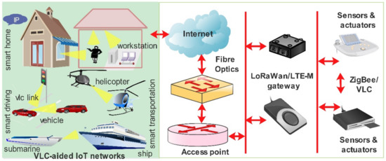 The high data rate, intrinsic security, and safety of VLC joined with the flexibility and scalability of radio communications create a high-performance and robust hybrid communications system to meet the ultra-high network capacity requirements of IoT networks. Having hybrid devices and a reconfigurable network that can adapt to their radio environment by dynamically selecting the best operating modes will result in a high-performance wireless communications network. Research contributions in VLC have proposed and demonstrated that nodes or devices equipped with both radio and optical interfaces can exploit the best features of both communication systems to support high data rate services [26].