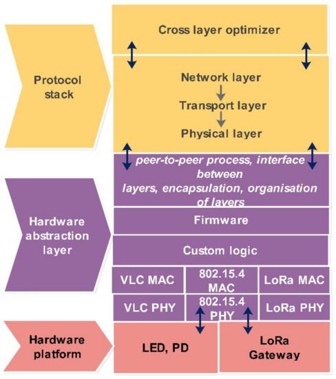 The proposed architecture comprises a VLC-aided central network, e.g., VLC-aided smart home, VLC-aided smart transportation, etc., a set of sensors and actuators and APs that are capable of communicating with VLC-IoT devices with different communication technologies [16,38]. Essentially, each technology and network is a sub-network of the architecture. The central network, e.g., the VLC-aided smart home consists of a number of VLC APs fitted to the room ceiling or street/traffic lights in VLC-aided transportation [39]. Each VLC APs has LED lamps for lighting which also supports communication for IoT devices. The sensors and actuators network consist of sensors that collect and transmit data as well as actuators that perform specific IoT-related functions [40]. A ZigBee coordinator manages and controls the interaction and communication between the sensor and actuators that use the ZigBee communication protocol, while a VLC gateway coordinates the communication of nodes in the sensors and actuators network that use the VLC protocol [41]. The communication between the central networks and the sensor and actuator network is executed using LoRaWan/LTE-M to permit long-distance communication between the sensors and the internet network. The architecture deploys a frame format that permits node discovery, identification, and routing so that each node can effectively communicate with other nodes in the architecture. The frame format is capable of redirecting data and controlling messages between the different subnetworks and is compatible with VLC technology. When a frame arrives at an AP, the AP reroutes it within a subnetwork or outside the subnetwork using unique node identifiers and a MAC which directs the frame to the destination IP address [19,38]. The frame translation, re-routing, node identification, and communication functionalities which guarantee interoperability between the different technologies are realized by a layered model. The protocol stack executed in the model allows the VLC-IoT nodes to translate frames arriving from different technologies and to redirect them to the IP address inside the cell or outside the cell. The resultant frame is suitable for communication with any device on the network regardless of their subnetwork or protocol. As presented in Figure 2, the protocol stack is driven using a cross-layer optimizer. Moreover, the protocol stack is implemented in a software-defined fashion to enable intelligent and fast adaptability to achieve optimized performance between protocol layers. The front-end hardware implemented in the VLC-aided IoT network are LEDs as transmitters and photodiodes, optical cameras as receivers, and LoRa gateways.