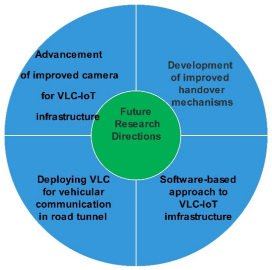 The advancement in electronics and telecommunication engineering has led to the development of enhanced components and technologies in VLC. Therefore, there is bound to be renewed research efforts in VLC-IoT. We discuss some possible future research directions and provide a summary in Figure 3.