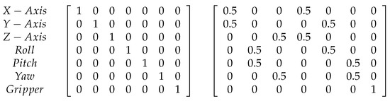 This representation allows for combinations of multiple output DoFs for one input DoF. For example, if the first column contains a value of 0.5 in the first two rows, engaging the first input DoF would result in a diagonal movement along the XY plane of the robot’s coordinate system (see the matrix on the right in Figure 1). According to the current situation, the proposed control concept adaptively fills this matrix to create the most useful combination of output DoFs.