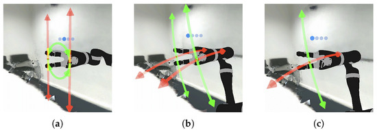 When interacting with robots that carry out movements, a study by Cleaver et al. showed that users generally prefer to have a visual representation of the robot’s future movements. However, having this visualization does not significantly affect the performance when executing tasks using the robot [23]. When using a visual representation of robot motion intent, the most prominent solution is to show the robot’s movement using arrows [24,25,26]. In addition, most of these approaches rely on Augmented Reality to overlay the visual representation on the user’s real environment.