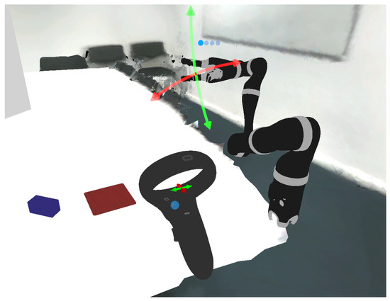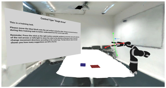 We designed a Virtual Reality environment based on a photogrammetry scan of a real room. The environment included a virtual model of the Kinova Jaco (Kinova Jaco robot arm: https://assistive.kinovarobotics.com/product/jaco-robotic-arm, accessed on 3 January 2022) robot arm attached to a table, a red target surface, a blue block, and two virtual screens—one for descriptions and questionnaires and one that would show example photos of the control types (see Figure 5). We decided to use a virtual model of a real robot arm (Kinova Jaco) to stay as close to a physical system as possible. Additionally, the Kinova Jaco robot arm is specifically designed and often used as an assistive device for people with motor impairments [5].