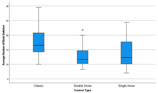 - Average Number of Mode Switches While participants executed each trial with the robot arm, each mode switch executed by pressing a button on the input device was counted and stored as the number of mode switches. Then, the average number of mode switches for each control type was calculated across all participants.