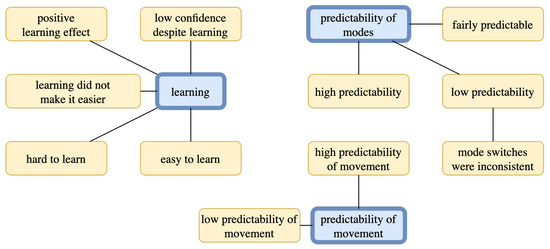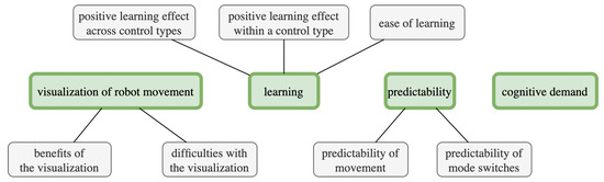 We identified the following themes in the combined thematic map: visualization of robot movement, cognitive demand, predictability of mode switching, predictability of movement and learning. The excerpts from one participant’s audio messages were marked with the participant’s unique number (e.g., P26 for the 26th participant out of the total 39 participants). Since participants often referenced the previous control types they used, we also added which control type they were referring to in brackets when citing them.