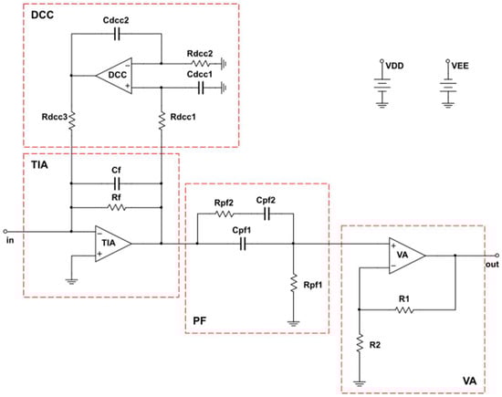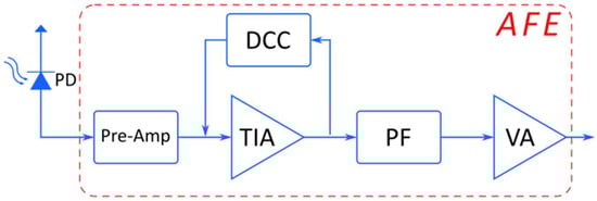Our work focuses on a receiver circuit that uses a photodiode as the optical signal sensor. The basic structure of the AFE of the VLC receiver under consideration consists of: (a) a photodiode (PD), (b) a pre-amplification circuit (Pre-Amp), (c) a TIA, (d) a DC cancellation circuit (DCC), (e) a passive filter (PF) and (f) a voltage amplifier (VA), as shown in the block diagram of Figure 1.