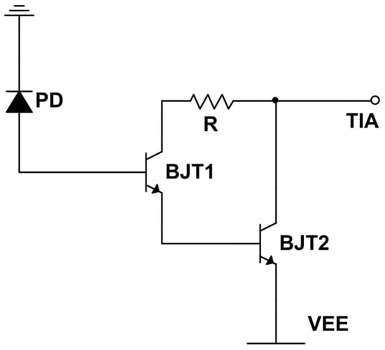 The first pre-amplification topology, along with the photodiode, is shown in Figure 3. It is the simplest topology consisting of a bipolar transistor where its base is fed by the current signal produced by the photodiode. The base current is amplified at the collector according to the BJT current gain factor (hFE) and the amplified current signal drives the TIA–DCC blocks.
