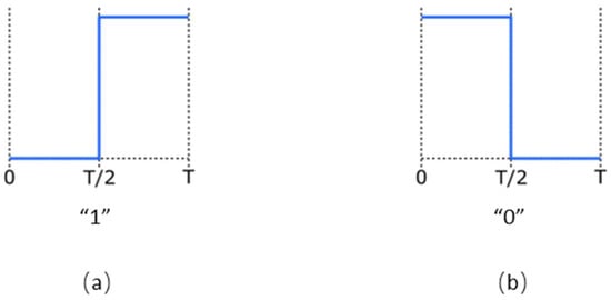 In order to use a realistic current signal, it was necessary to consider an appropriate data-encoding method according to the IEEE standard [18]. The Manchester encoding was chosen, where the logic high bit (“1”) is encoded with a low to high transition during one period of the system clock (Figure 7a), while the logic low bit (“0”) is encoded with a high to low transition accordingly (Figure 7b).