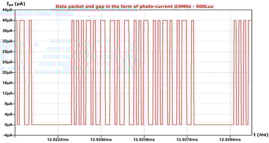In order to simulate a realistic operating scenario for the receiver, a Manchester-encoded 24-bit input sequence was created that is followed by an empty span of 16-clock periods. This results in the creation of a data package and a blank space after that, which is continuously repeated as shown in Figure 8. The generated sequence controls the current source of the photodiode model in Figure 6. The pulse amplitude and max frequency are determined according to the incident luminous power and the system clock frequency, respectively.