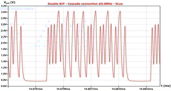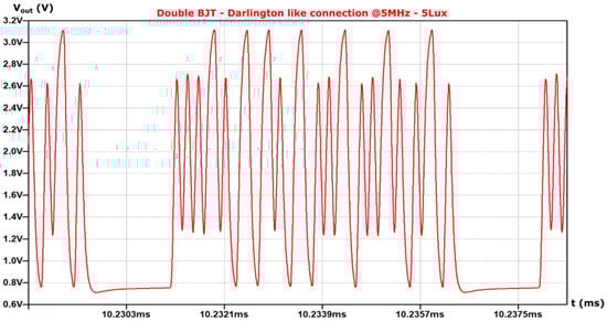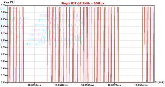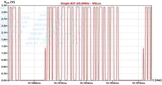 For the first pre-amplification topology (I) (single BJT), as the incident illuminance in the photodiode decreases, the signal integrity is lost at 95 Lux, as shown in Figure 9. On the contrary, for the pre-amplification topologies (II) and (III), the signal integrity is lost at the illuminance of 5 Lux, as shown in Figure 10 and Figure 11 respectively. Note that for the AFE topology without pre-amplification signal integrity issues arise below 120 Lux.
