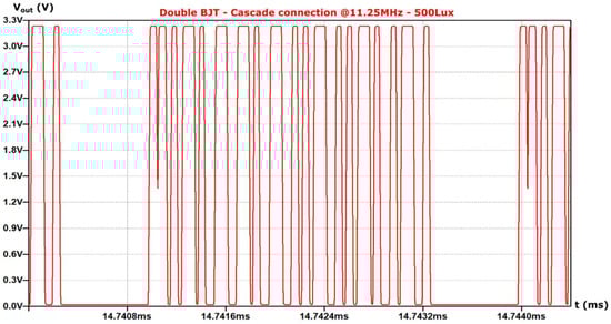 In order to determine the influence of the light power intensity on the receiver operation, the illuminance intensity value (Lux) was changed in the subcircuit of the photodiode by changing its photocurrent accordingly. A constant signal transmission frequency of 5 MHz was considered as a typical frequency of the system.